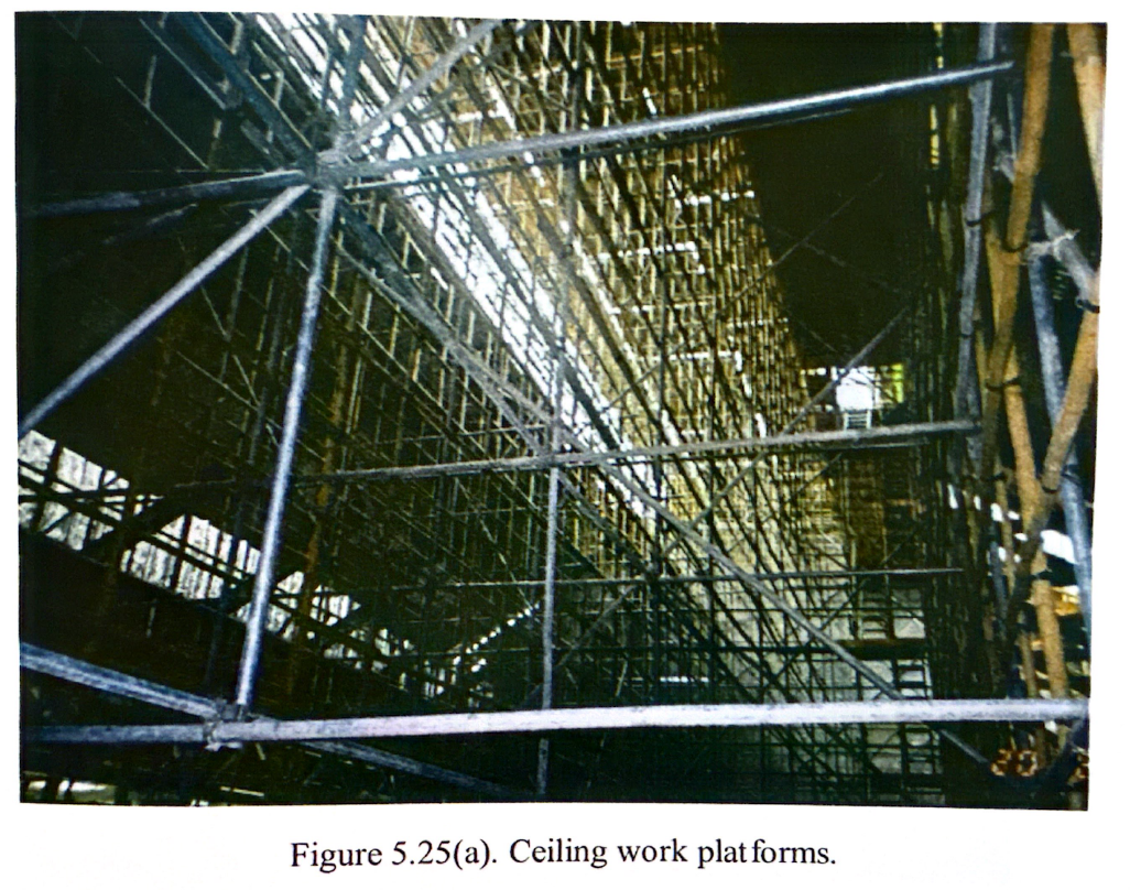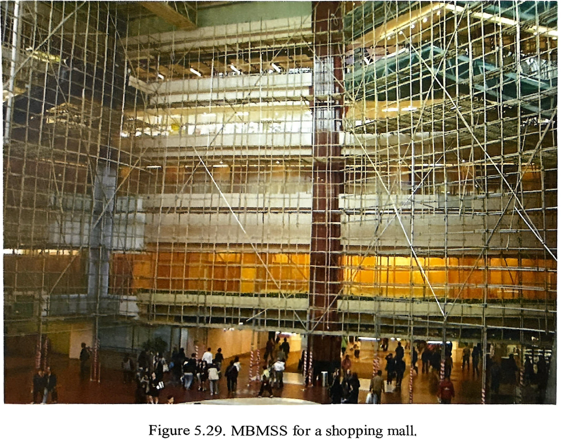 截取至:2009年城市大學蘇汝成博士論文第四章第二節 革命的必要性MBMSS為雙層棚架結構,主要由鋼管與竹竿構成。其中,鋼管作為主立柱與邊緣構件,承擔主要荷載。與純竹製棚架相比,這種結構能為作業人員提供更穩定、安全且可靠的作業平台。
