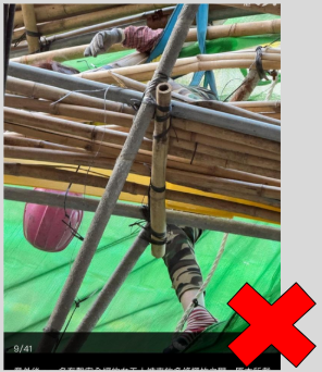 意外事故中的混合棚架不符合標準,圖中斜杆由一條鐵通及一條高杆相交並用膠篾作為連接位,導致鐵結構承重不足。